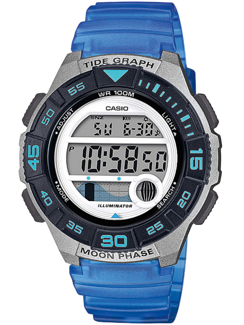 24 de ore, Chronograph, Data, Faza de Luna, Gezeiten, Luna, Minute, Oră, Schlummerfunktion, Secunde, Timer, Ziua saptamanii, Zona a doua oară